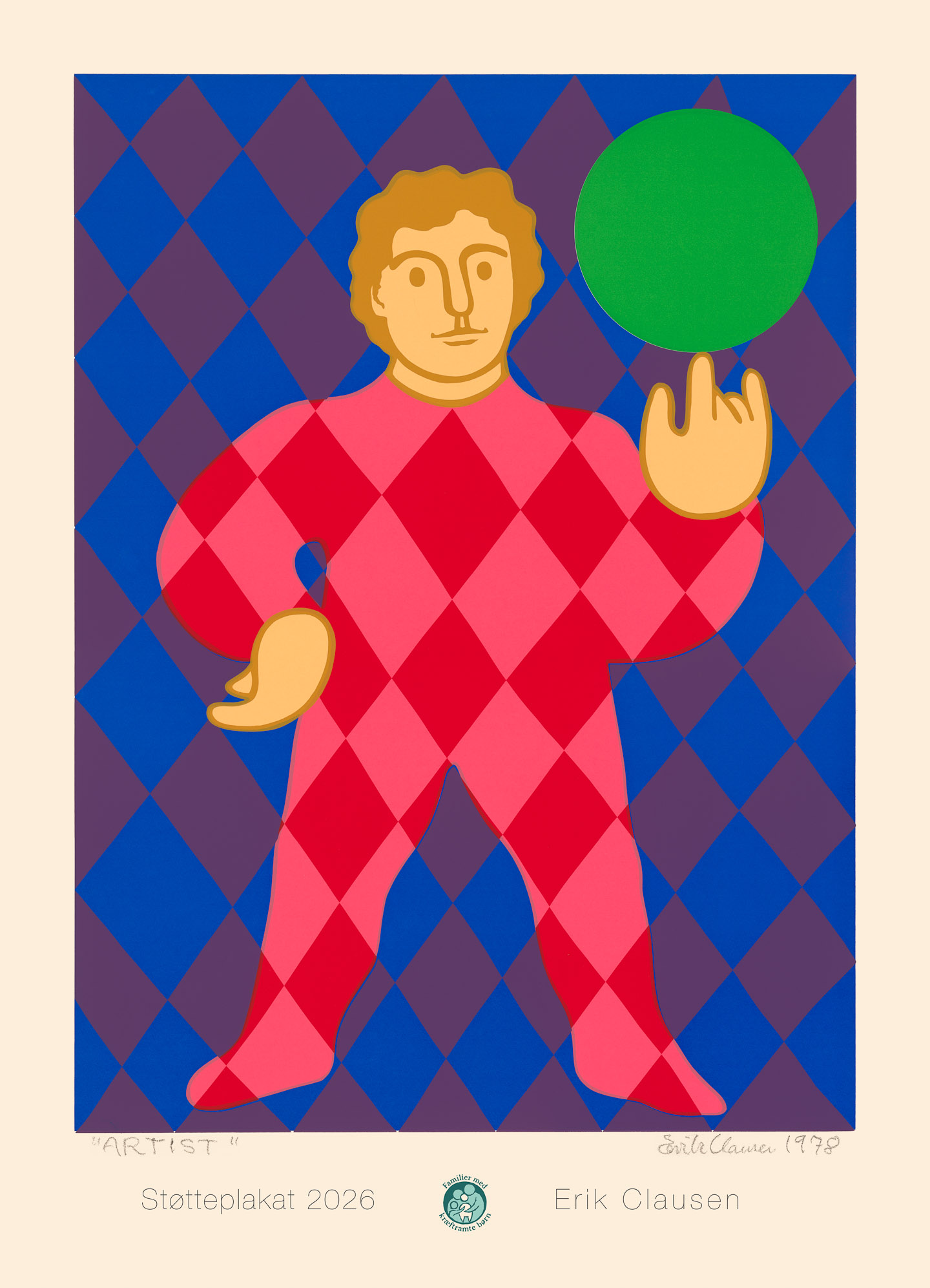Hans enke, Pernille Clausen, har givet tilladelse til, at vi må bruge dette ikoniske motiv fra hans tidligere cirkus-periode. Maleriet viser en artist i klassisk harlekin-dragt – stående med en bold balancerende på fingerspidsen og det klare budskab: “Se mig – se hvad jeg kan…!”